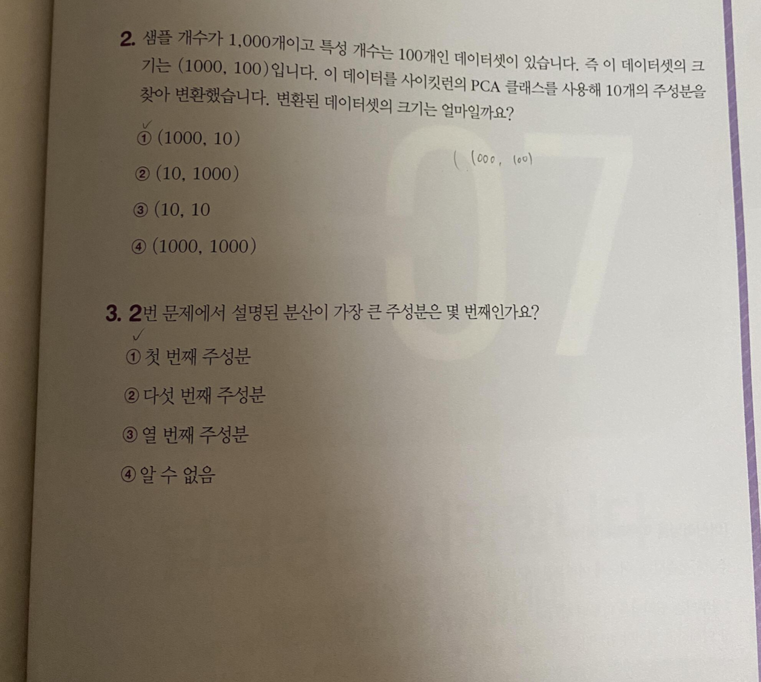 2. 변환된 데이터셋은 100개인 특성을 10개로 줄여주었으므로 (1000,10)이 된다.