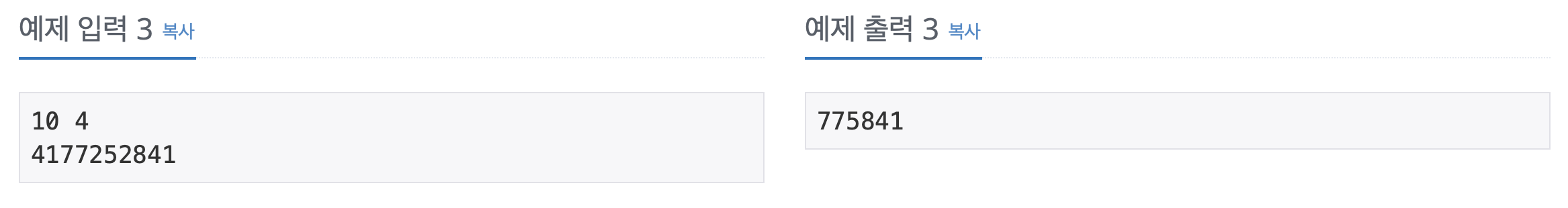 N자리 숫자가 주어졌을 때, 여기서 숫자 K개를 지워서 얻을 수 있는 가장 큰 수를 구하는 프로그램을 작성하시오.